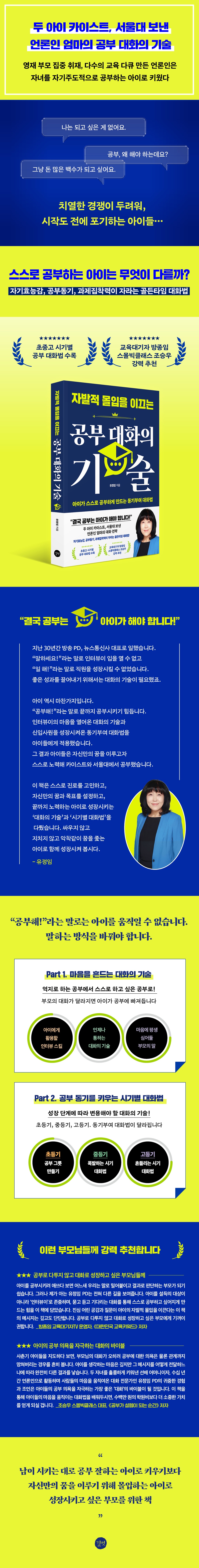 두 아이를 각각 카이스트와 서울대에 보낸 언론인 엄마의 대화 전략을 담은 《자발적 몰입을 이끄는 공부 대화의 기술》은 부모의 잔소리와 통제가 아닌 ‘대화의 힘’으로 아이의 공부 불씨를 키우는 방법을 다룬다. 꿈을 꾸기도 전에 경쟁의 압박 속에서 무기력해지는 아이들이 늘고 있는 지금, 억지로 시켜서 하는 공부는 끝까지 해나가기 힘들다. 저자는 아이를 신입사원이자 인터뷰이처럼 바라보며 일방적인 지시 대신 질문과 공감으로 공부의 의미를 스스로 찾게 하는 동기부여 대화법을 제안한다. 자기효능감·공부동기·과제집착력을 키워줘야 하는 초등기, 비교와 흔들림을 겪는 중등기, 치열한 입시를 버텨야 하는 고등기까지 성장 단계에 맞는 부모의 말과 태도를 구체적으로 안내한다. “공부해!”라는 말 없이도 아이가 자신의 꿈을 향해 자기 주도적으로 공부할 수 있도록 돕는 실질적인 자녀교육 가이드다.